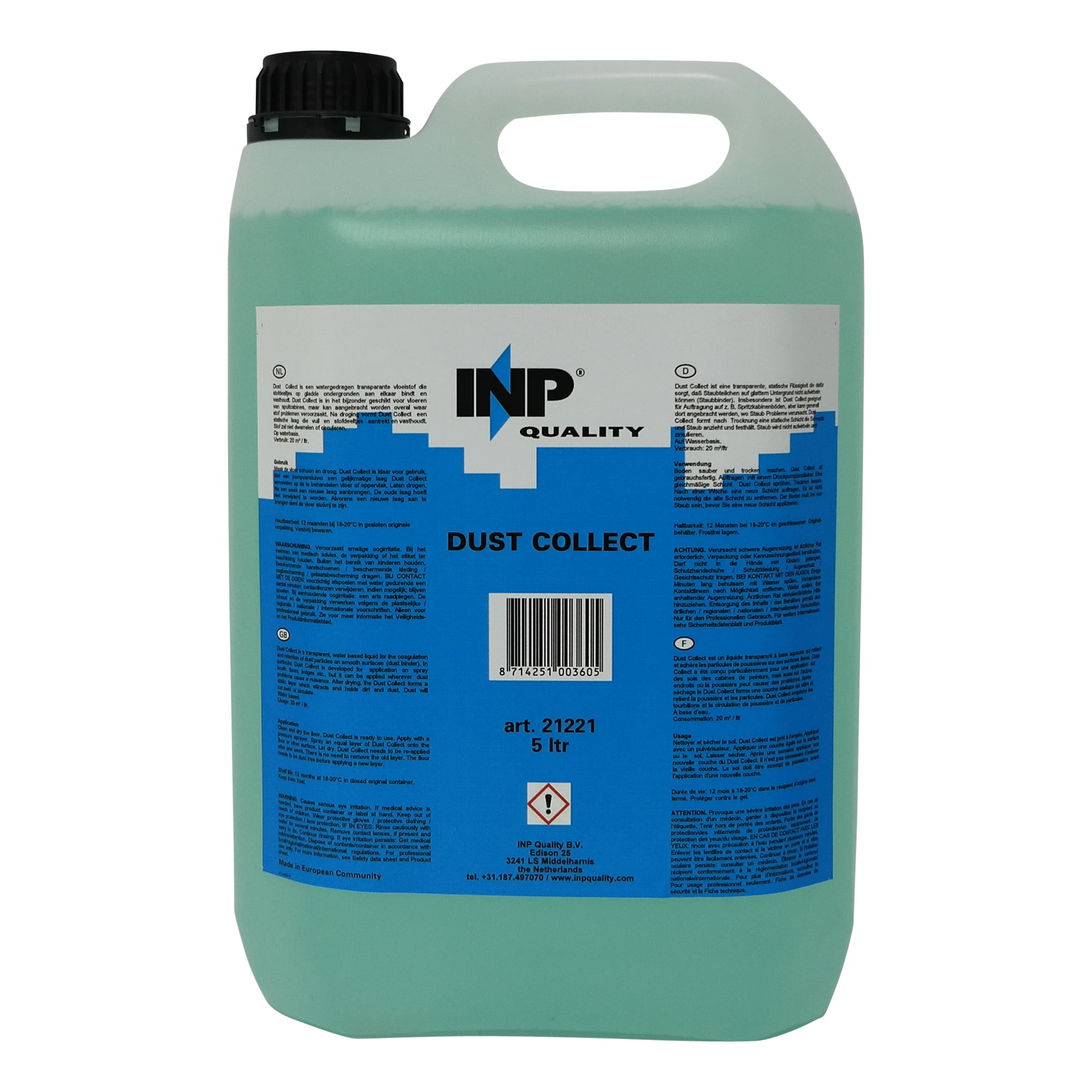 Dust Collect is een transparant-groene oplossing op waterbasis, speciaal ontwikkeld om stof vast te houden. Dust Collect sluit het stof in en voorkomt dat het zich opnieuw verplaatst. Bevat tevens een doeltreffende luchtverfrisser voor een frisse werkruimte. Dit product kan gebruikt worden op muren, vloeren en richels in bijv. spuitcabines, opslagruimtes en andere plaatsen waar beheersing en beperking van stof belangrijk is.