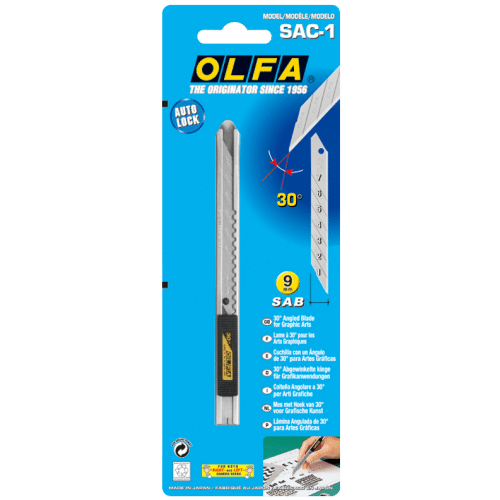 OLFA® Stainless Steel Snap-Off Graphics SAC-1 Knife 9mm afbreekmes met mes onder hoek van 30 graden.