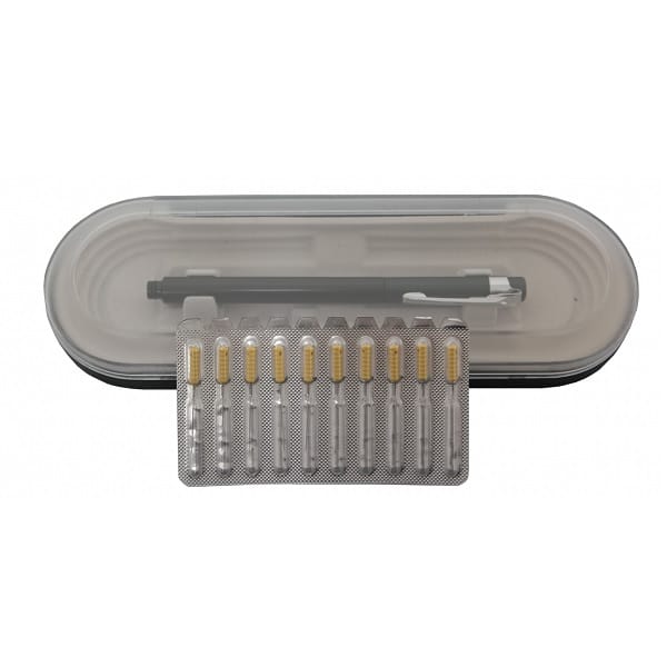 Het stofnaalden setje bestaat uit een pen houder met 10 stofnaalden afzonderlijk verpakt in blister verpakking.