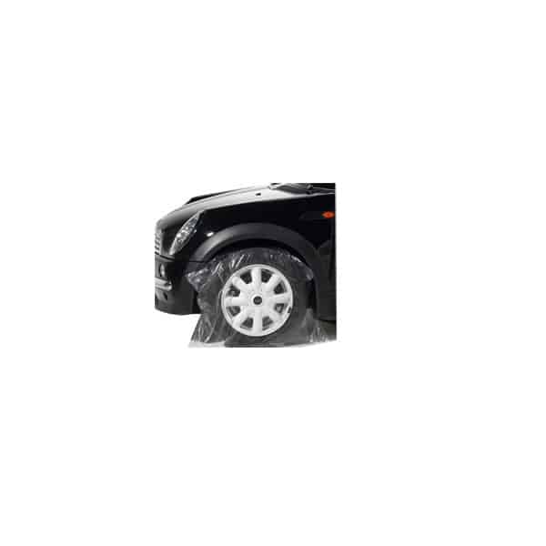 Transparante wielhoezen die wielen beschermen tegen verf en andere producten tijdens autoschadeherstelwerkzaamheden.